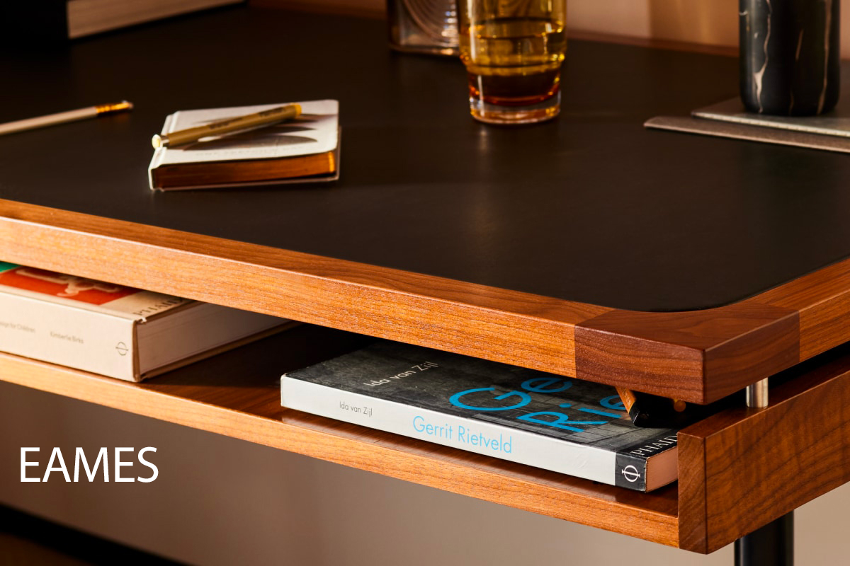 Eames 2500 Series Executive Desk: The Eames 2500 Series Executive Desk epitomizes the iterative spirit of its designers. It starts with the strong, clean T-leg design from Charles and Ray Eames’ 2500 Series, a range of multi-use tables that were ahead of their time when introduced in 1961. These are paired with an expansive, raised desktop, which was based on a one-of-a-kind prototype. Available in a choice of premium veneers with a unique leather inlay option, the result is an executive desk you can design a room around:
