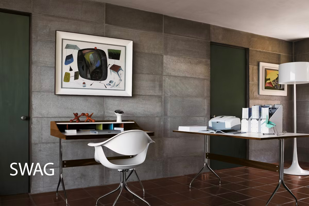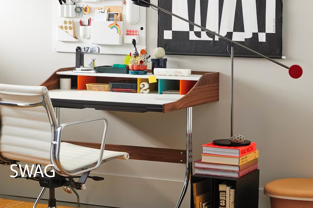Nelson Swag Leg Desks: Introduced in 1958 by Herman Miller’s then-design director, George Nelson, the Nelson Swag Leg Desk has retained its relevance over the decades. The cubbies’ brightly colored dividers add a sense of play, while the drawers’ removable organizer trays keep things tidy. Fashioned from 16-gauge steel, the legs of this storage office desk feature leveling floor glides to accommodate uneven surfaces. This is the authentic Nelson Swag Desk by HermanMiller that features: